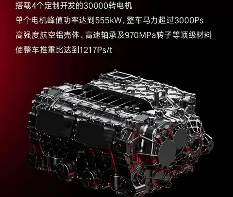 动力方面,新车采用全域1200V超高压平台,配备四电机系统,系统总功率达到了2220千瓦,推重比达1217马力/吨。新车还配备全新的赛道级刀片电池,通过优化电芯、降低内阻,配合全新的双层冷却结构,实现了30C的超高放电倍率。