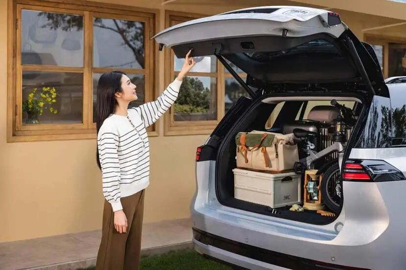 车辆尾部,新车采用贯穿式尾灯设计,双层灯带设计,中央是自发光的车标,尾灯内也隐藏了辅助驾驶小蓝灯,整个尾部富有肌肉感。新车后排车门可以接近90度开启,上下车更方面,尾部配备电动尾门,低门槛设计。埃安i60在五座满员状态,后备箱储物空间是416L,而且采用两层储物结构。放倒二排座椅,埃安i60的整个容积能够扩展至967L。