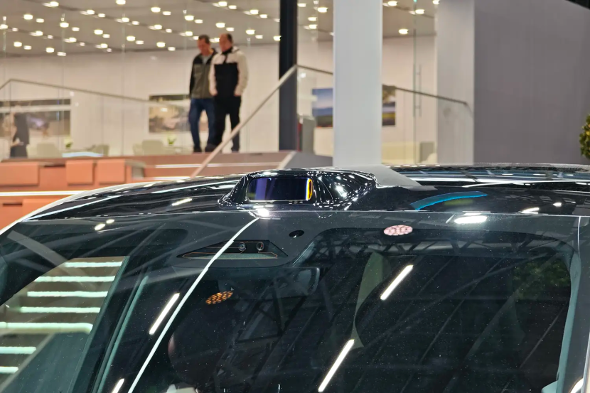 岚图泰山已经上市了,4个配置,官方指导价37.99-50.99万元。先来看前脸,是这种密辐竖条镀铬+分体大灯的设计,然后岚图LOGO和日行灯可以组成一个灯带。头顶这块看,华为超500线激光雷达,然后全车共计4个激光雷达,数量上已经快赶上一侧的倒车雷达了。